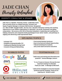 Jade Chan is a Leadership Consultant, Speaker, Career Coach, and currently serves as a Global Diversity, Inclusion and Equity Senior Product Manager at Amazon Web Services. Recognized as a "Best of AWS" thought leader, she has over a decade of diversity training and coaching experiences at over fifteen organizations in education, non-profit, businesses and global corporations. She serves as the CEO of Diversity Unleashed, a leadership and coaching firm helping visionaries and companies build psychological trust, better leaders, and pathways to tapping and advancing underrepresented talent.